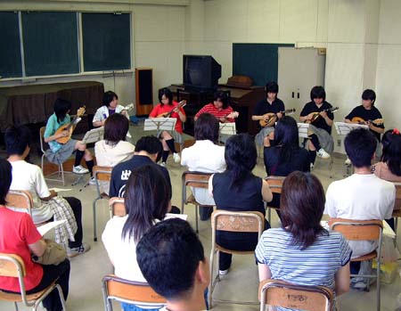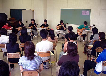| 〜プログラムより〜 【月高マンドリン祭】 2004年7月17日(土) 午後1時30分〜 B棟3F音楽室にて開催 (プログラム) 1.小組曲 ト長調(K.ヴェルキ.) 2.民謡「木曽節」に基づく小狂想曲(池ヶ谷一郎) 3.涙そうそう(BEGIN) 4.ねこバス(久石 譲) 5.となりのトトロ(久石 譲) 6.ハレオ・デ・ヘレ(A.アマディ) アンコール.丘を越えて(古賀 政男) |